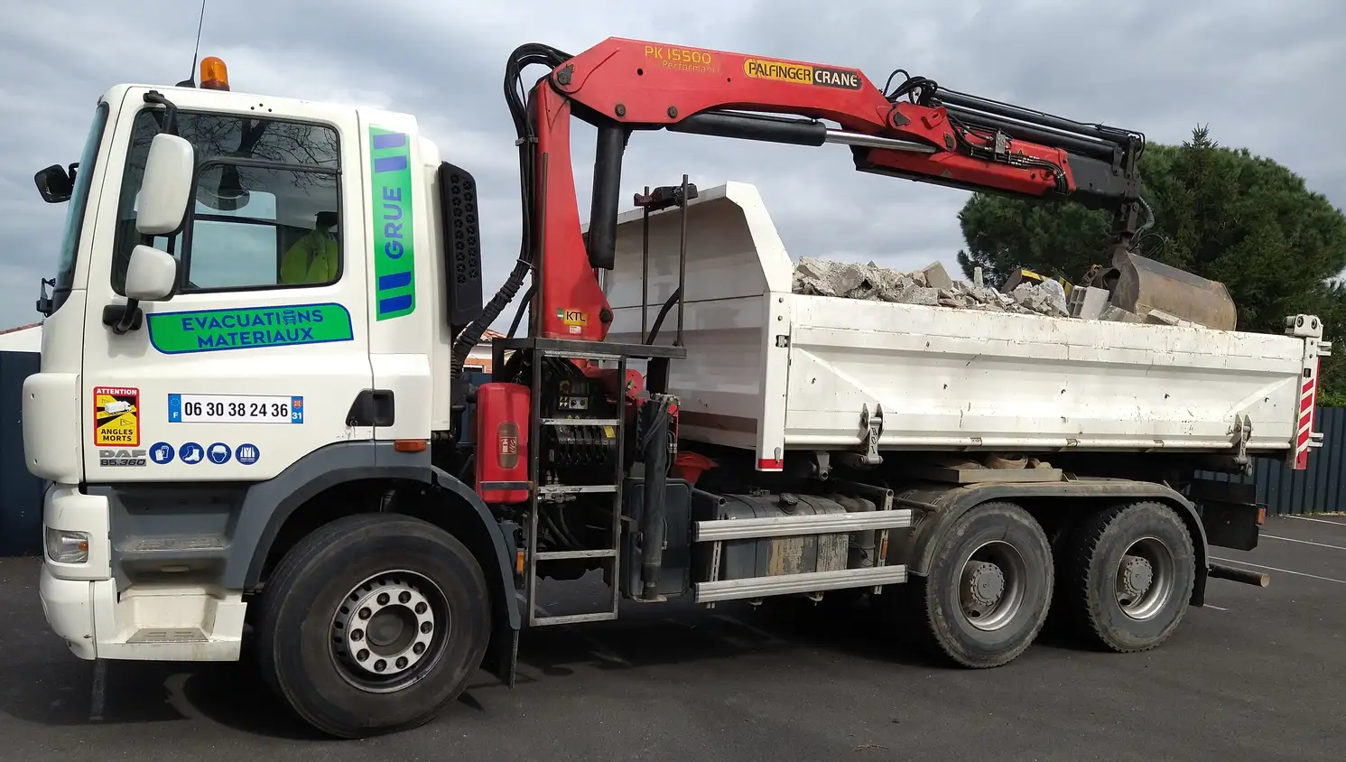 Spécialiste de l'enlèvement de déchets de chantier. Fini la corvée de la déchetterie et les maux de dos : nous chargeons vos matériaux à votre place grâce à notre camion benne équipé d'une grue !